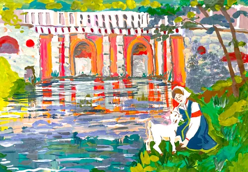 На картине изображён живописный уголок Лефортовского парка с изящным гротом Растрелли, украшенным белокаменными колоннами. На переднем плане разворачивается сказочная сцена: милая Алёнушка в традиционном русском наряде сидит на лужайке рядом с братцем Иванушкой, превратившимся в козлёнка. Их фигуры гармонично вписаны в пейзаж, создавая волшебную атмосферу. Художник умело соединил историческую архитектуру с фольклорным сюжетом, что делает работу особенно выразительной. Картина передаёт как величие старинного парка, так и теплоту народной сказки.
