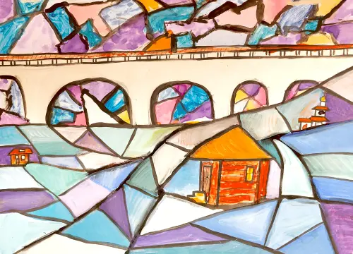 Добрый день! Меня зовут Валера, я занимаюсь в студии ИЗО при школе 1499. Благодаря идее, энтузиазму и помощи моего педагога Галкиной Светланы Владимировны, получилась такая замечательная работа - стилизованный образ главной достопримечательности нашего района - Ростокинского Акведука!