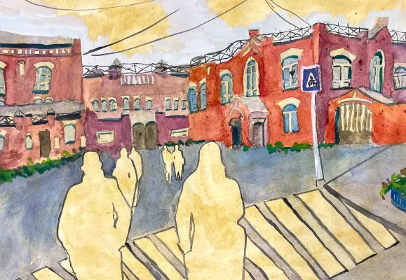 На рисунке изображён архитектурный комплекс завода «Кристалл» — исторического промышленного объекта, построенный по проекту архитекторов Н. Г. Фалеева и В. А. Величкина, находится в современном районе Лефортово, на берегу реки Яузы и является уникальным образцом промышленной архитектуры.