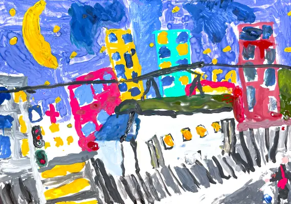 Рисунок, выполненный гуашью, изображает ночную улицу района Лефортово с домами и ночным освещением. На картине видны очертания зданий и улицы, а также звёздное небо. Яркие краски и чёткие контуры создают ощущение спокойствия и таинственности ночи. Работа передаёт атмосферу уюта и романтики, привлекая внимание к красоте ночного города и создавая ощущение волшебства звёздной ночи.