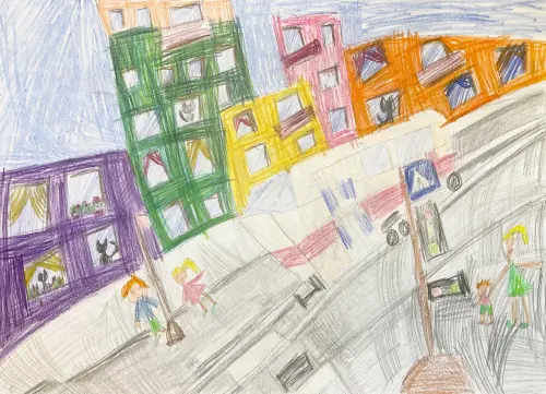 Рисунок, выполненный цветными карандашами, изображает улицы Лефортово с трамвайной линией, трамваем, домами и пешеходами. На рисунке видны чёткие контуры и выразительные детали, передающие атмосферу городской жизни. Разнообразные оттенки карандашей и динамичные элементы, такие как движущийся трамвай и пешеходы, добавляют рисунку живости. Работа подчёркивает уникальность района и его особенности, привлекая внимание к деталям городской среды.