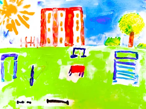 Я нарисовала мой дом, где я живу. И площадку, на которой я люблю гулять, играть в различные игры, качаться на качелях. Люблю играть в настольный теннис. Особенно люблю гулять летом, когда светит солнце и кругом много зелёной травы и деревьев!