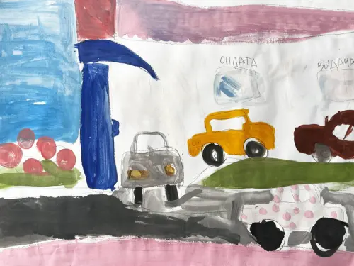 Я вчера нарисовала свой любимый магазин в Гольяново. Я люблю туда ходить с мамой, потому что там вкусные бургеры и картошка фри.На входе стоят большие яркие вывески, а на окне — аппетитные пирожные и пончики. Я нарисовала свою любимую жеелтую машину с окном, за которым видно кассира. Мне нравится этот магазин, потому что там всегда вкусно и весело. Я хочу, чтобы у меня получился самый красивый и яркий рисунок