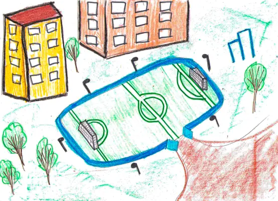 Я очень люблю свой двор. У нас во дворе есть футбольное поле, на котором я с друзьями часто играю в футбол. Ещё у нас есть турники, там мы тоже занимаемся. Вечером мы тоже играем.