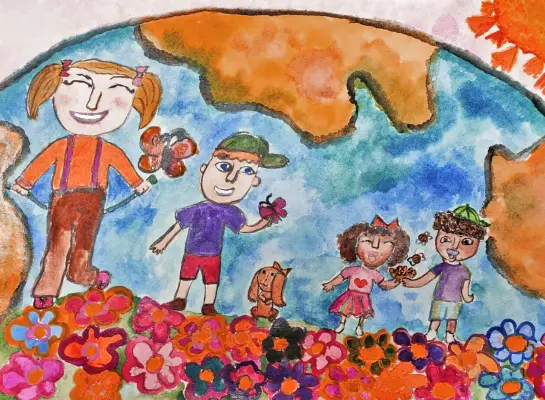Работа нарисована акварельными красками на формате А3. На ней изображён праздник двора, который проходил в нашем районе в День защиты детей. Я гулял с друзьями, нам было весело.