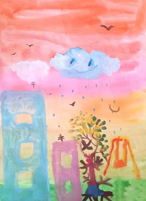 Здравствуйте! Меня зовут Полина. Я хожу в садик. У меня есть сестричка Олеся и братик Всеволод. Я очень-очень люблю рисовать. Я нарисовала тучку и дерево... я люблю песню "Злую тучку наказали" и я решала для неё нарисовать этот рисунок. (Со слов дочери).