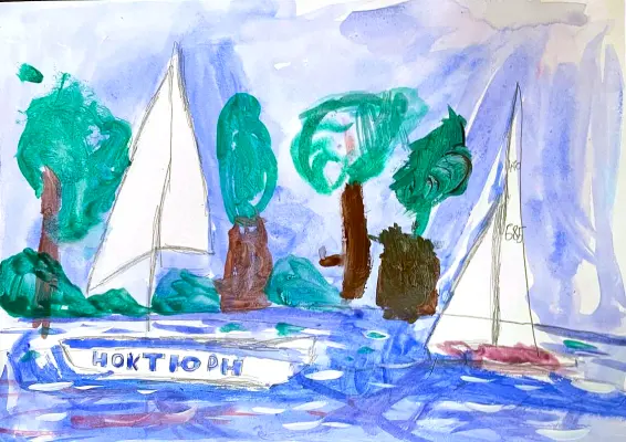 На рисунке изображено мое самое любимое место в районе Косино-Ухтомский - озеро Белое. Вода в озере голубая, а небо светлое, с лёгкими облаками. По воде плывут красивые парусники оставляя за собой на воде рябь. Летом мы часто ходим с родителями туда гулять и купаться. Я очень люблю наблюдать за уточками и рассматривать кувшинки у берега.
