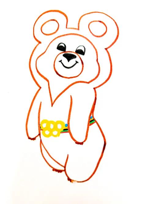Рисунок Олимпийского мишки – талисмана Игр-80 в Москве. Добрый бурый медведь с улыбкой и поясом с кольцами, излучающий гостеприимство, радость, и спортивный дух.