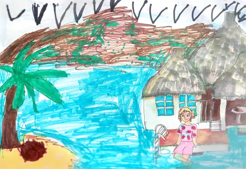 Меня зовут Полина. Я живу в красивом районе. Мне нравятся фонтаны и море. Мечтаю о дворике с пальмой. Очень люблю природу. Сестренка Эмма помогла нарисовать мою мечту.