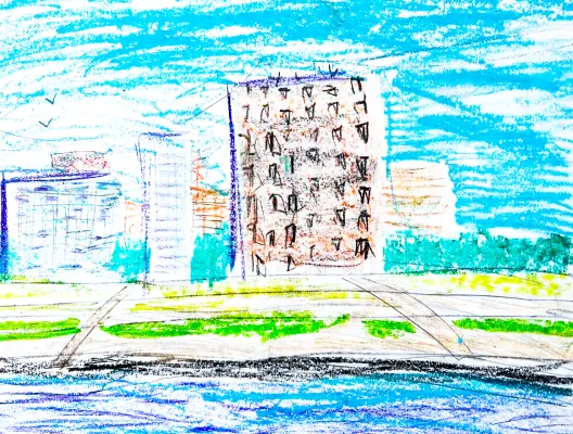 Я живу в районе Гольяново. Здесь есть и красивый парк с прудом, и много старых уютных дворов, и много новых, больших и красивых, современных построек. Я изобразила пруд и большие новые дома неподалёку.