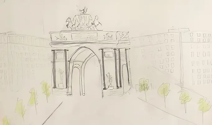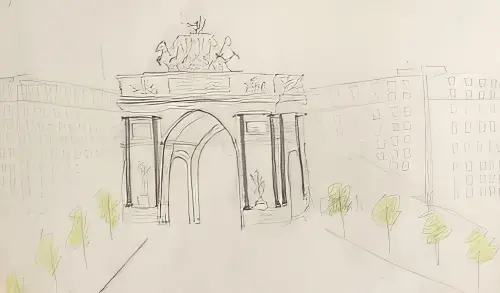 Я нарисовал триумфальную арку, которая является одним из символов моего района Дорогомилово. Каждый день я проезжаю мимо нее, когда еду в школу, а вечером она подсвечивается и это очень красиво