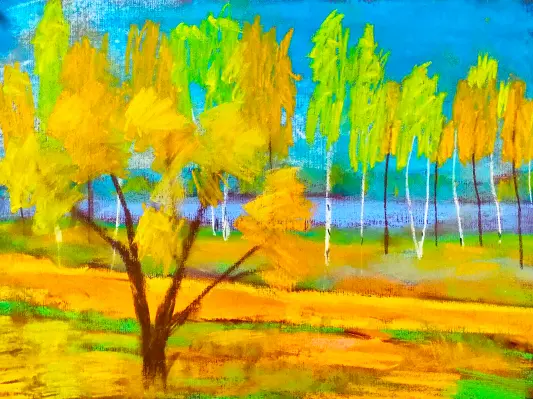 Работа нарисована масляной пастелью, формат А3. На ней изображен Итальянский пруд осенью. Этот пруд находится в парке Радуга, недалеко от моего дома.