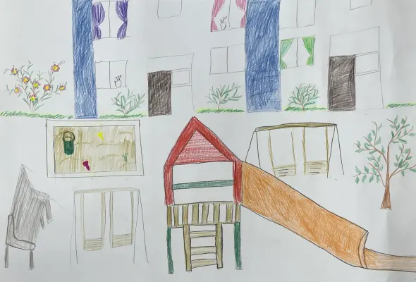 На картине я изобразила свой любимый двор. Это место детской радости и веселья! Мы с братиками любим играть в нашем дворе на детской площадке и кататься на качелях!