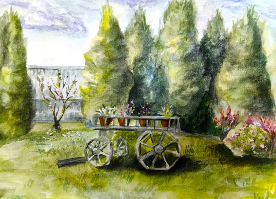 Я нарисовала небольшой участок в нашем дворе. Наш двор небольшой, но жители наших домов его украшают своими силами и эта тележка с цветами дело рук жителя нашего двора. Кто-то сделал деревянную тележку и посадил в нее цветы, теперь эта садовая клумба украшает наш двор.