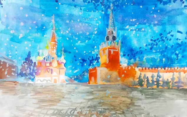 Художественная работа выполнена гуашью на ватмане. На картине изображена Красная площадь города Москвы в период новогодних праздников. Легкий падающий снег создает атмосферу спокойствия и радости.