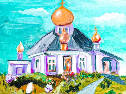 Моя работа выполнена в технике масляной живописи на картоне. Я решила попробовать новым материалом. Меня вдохновил Богородский храм в нашем районе. У него красивая архитектура.