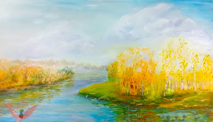 Художественная работа выполнена гуашью на ватмане. На картине изображены две реки, которые сливаются в большой речной поток. Вид на слияние очень живописен и располагает к написанию пейзажа.