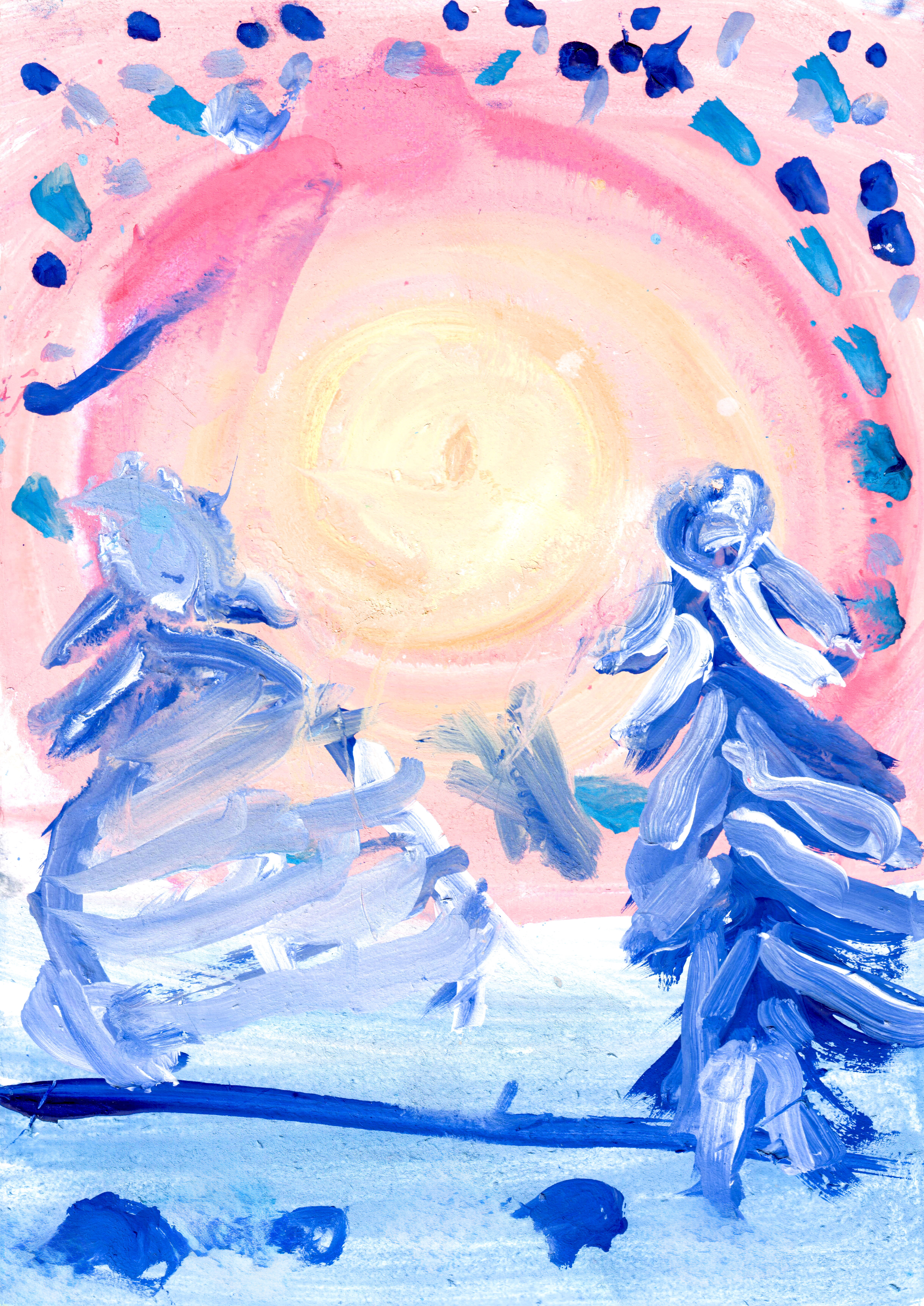 Здравствуйте, уважаемые члены жюри. Меня зовут Лидочка. Мне 5 лет. Но мама называет меня непоседа, а папа ласково-бандитка. Мне действительно очень сложно сосредоточиться на каком-то занятии из-за моей гиперактивности. Единственное, что меня надолго увлекает-это рисование и пазлы. Поэтому год назад моя мама отдала меня в студию по рисованию при моём детском садике. Однажды мы пошли гулять с родителями в нашем районе по живописным дорожкам Салтыковского лесопарка. Меня очень впечатлили снежные сосны и ели на фоне розового заката и я решила нарисовать свои эмоции на бумаге.