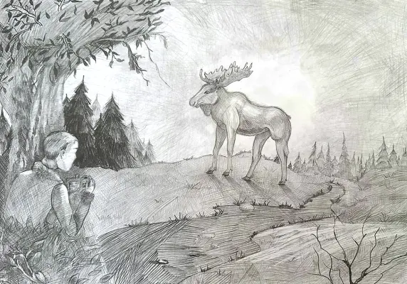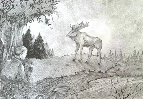 Мой рисунок - это фантазия на тему сюжета в парке Лосиный остров. Работа выполнена в графике, обычным карандашом. Формат листа а3. Я и сам встречал лося в парке, правда он был далеко.