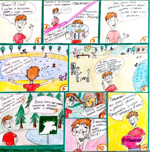 Я очень люблю свой район Гольяново. Здесь мой дом, моя школа, мои друзья. Моим любимым местом отдыха является Гольяновский пруд. Рядом с ним находится Гольяновский парк, в котором мы любим гулять всей семьей. Моя работа представляет серию рисунков, рассказывающих о Гольяново. Каждый рисунок сопровождает комментарий, в котором можно узнать много интересного про наш замечательный район.