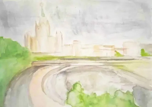 Я гуляла по парку Зарядье в центре Москвы по подвесному мосту и решила запечатлеть на рисунке красивый пейзаж. Моя работа выполнена на формате а4, акварелью.