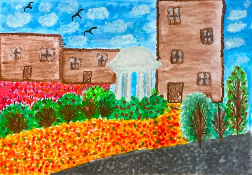 Самое любимое место в моём районе - это зелёный парк с белыми беседками. Здесь свежо, растут деревья, вечером и утром поют соловьи. Я люблю посидеть здесь в тени деревьев или с белой беседке, которую нарисовала.