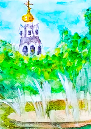 Я живу в районе Богородское, часто гуляю по Черкизовским прудам. Решила нарисовать красивый сюжет с видом на фонтан и церковь Ильи Пророка. Моя работа выполнена акварелью, формат а4.