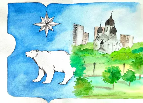 Я живу в районе Северное Медведково. Символом нашего района является белый медведь. Люблю свой район. На рисунке изображен медведь на гербе района.