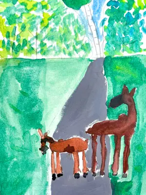 Я нарисовала лосей, потому что я люблю животных и люблю их рисовать. И рядом с моим районом есть парк Лосиный остров, в котором лоси живут как в дикой природе.