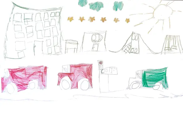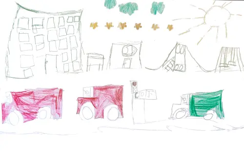 Я нарисовала двор, в котором провожу очень много времени. Во дворе есть детская площадка, куда я очень часто хожу с друзьями, так же во дворе ездят машины.