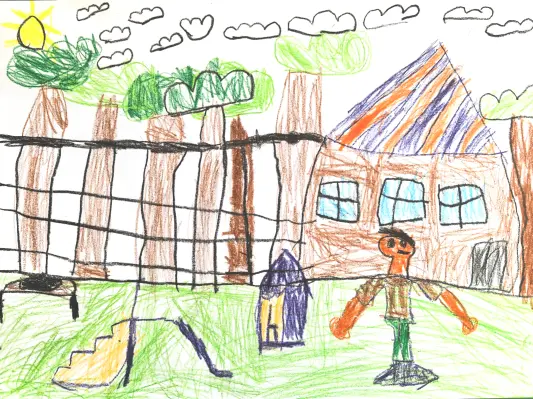 Меня зовут Артём, я очень люблю играть у себя во дворе. На площадке есть горка, домик для игр, разные лазалки, ещё на нашей площадке мы любим заниматься спортом.