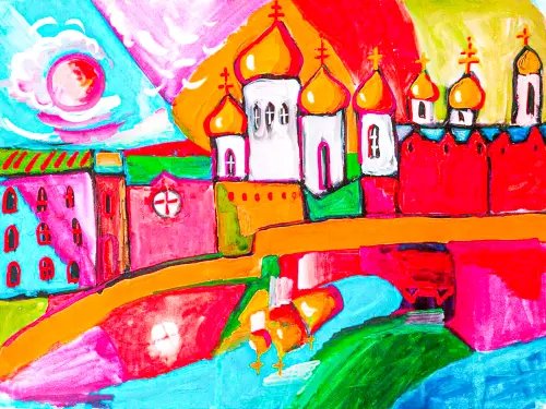 Я очень люблю свой город - Москву. Гуляя по центру, по набережной, на меня большое впечатление произвели сверкающие на солнце купола храмов Соборной площади. И мне сразу захотелось нарисовать эту игру красок.