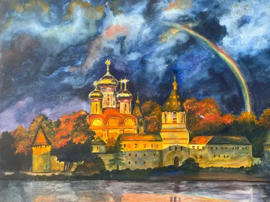 На этой картине запечатлена волшебная осенняя сцена Новодевичьего монастыря, омытого яркими красками радуги. Золотая листва деревьев, словно в танце, кружится вокруг древних стен, создавая неповторимую атмосферу умиротворения и красоты.