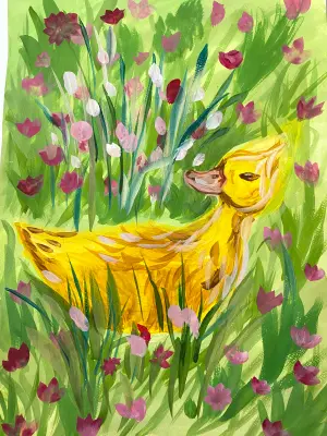 Солнечным летним утром на зелёной поляне появилась уточка. Мягко ступая по сочной траве, она неторопливо прогуливалась, наслаждаясь теплом и спокойствием. Вокруг пестрели яркие цветы: пушистые одуванчики, нежные ромашки и полевые колокольчики.