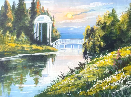 На этой картине запечатлен тихий уголок Москвы, утопающий в зелени летнего дня — Головинские пруды. В центре внимания — изящная белая беседка с колоннами, словно сошедшая со страниц старинного романа. Её ажурная тень мягко ложится на прибрежную траву, приглашая отдохнуть и насладиться умиротворяющим видом.