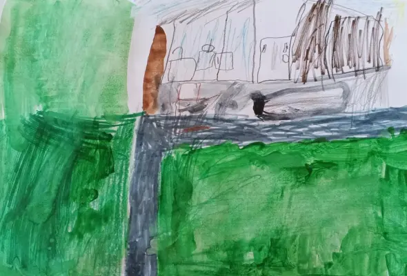 Это мой дом и двор возле него. Я нарисовал, как выглядит наш подъезд и дорожка, которая ведёт к дому. Рядом много зелёной травы — весной и летом здесь всё яркое и живое. У нас во дворе часто стоят машины, и мы играем рядом, бегаем, катаемся на велосипедах. Мне нравится наш район, потому что он зелёный, спокойный и родной.