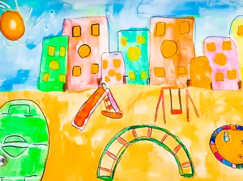 На рисунке изображён мой дом и мой двор, где чисто и никто не мусорит. Этот двор прекрасен тем, что в нём можно делать всё: играть в футбол, качаться на качелях, играть в песочнице, кататься с горки. Поэтому нам, детям, всегда весело и задорно!