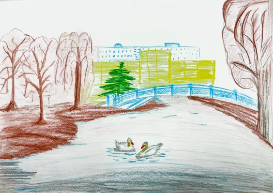 Любимый парк. Находясь в нём всегда хочется рисовать и рисовать. На рисунке изображены два лебедя, которые безмятежно плавают по глади пруда на фоне моста