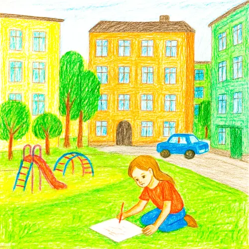 На картине девочка сидит на траве и рисует, рядом — игровая площадка и синяя машина. Яркие цвета передают беззаботные детские часы в любимом дворе на большой Якиманке.