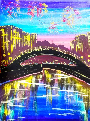 Яркий салют расцветает над величественным мостом, озаряя ночное небо каскадом огней. В этом захватывающем зрелище сливаются воедино инженерное чудо и красота пиротехнического искусства, создавая незабываемую картину праздника и восторга.