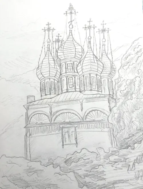 Работа «Церковь Положения Ризы Господской» выполнена карандашом на бумаге А4. Архитектура вдохновлена деревянными храмами Русского Севера — их изяществом, гармонией форм и множеством деталей, несмотря на скромные материалы. Особое внимание уделено куполам, которые устремляются вверх, создавая ощущение лёгкости и возвышенности. С помощью штриховки передано движение облаков, глубина пространства. Эта работа — попытка передать не только архитектурную красоту, но и дух времени, тишину и величие природы, окружающей храм.
