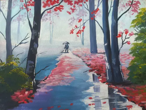 На картине запечатлена тихая и уютная осень в парке Капотни. Золотые и багряные листья устилают тропинку, создавая мягкий ковер под ногами. По этой тропе, укрываясь от моросящего дождя под большим зонтом, неспешно прогуливается влюбленная пара.