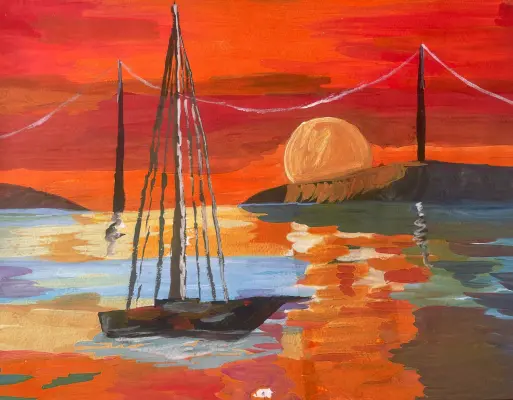 В центре внимания - изящный парусник, силуэт которого четко выделяется на фоне восходящего солнца. Он словно замер в ожидании попутного ветра, готовый отправиться в новое путешествие.