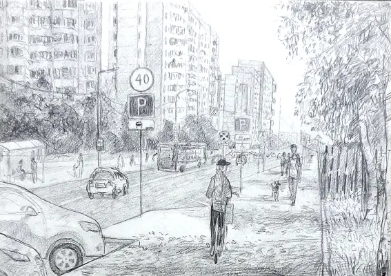 Графическая работа, на которой карандашом прорисованы детали одной из зеленоградских улиц. Ездят машины, жители Зеленограда торопятся по своим делам. Как будто зарисован один из дней обывателей.