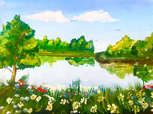 На этой картине запечатлен кусочек настоящего летнего счастья! Подмосковье, теплое солнце, и безмятежная гладь озера, отражающая небесную синеву. В воздухе витает аромат полевых цветов, а на переднем плане, словно маленькие солнышки, распустились ромашки.