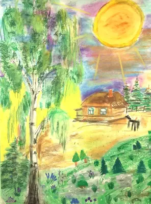 Моя работа называется «Моя деревня». Для меня моя родина — это моя деревня. Ее красивые поля, речки и озера. Я люблю проводить время в деревне, играть с ребятами и купаться.