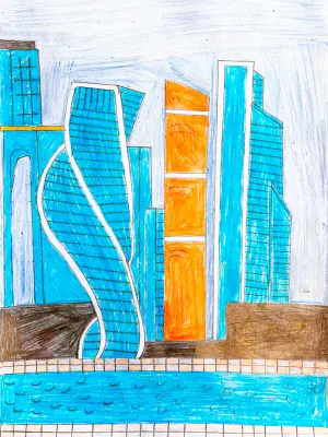 Я изобразил здания Москва-Сити, мне кажется, они смотрятся очень мощно и выделяются на фоне остальных районов Москвы. Мне больше всего по душе небоскреб «Эволюция», он необычно выглядит и привлекает внимание. Я даже видел этот небоскреб из городского лагеря в Парке Победы «Лето побед», что меня поразило.