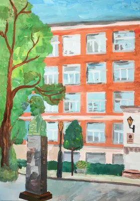 Работа выполнена гуашью на листе А3. На картине изображена школа им. А.С. Пушкина. В сквере около школы проходят тематические праздники, посвященные поэту.