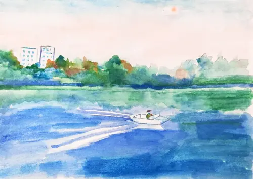 Работа выполнена акварелью совместно с мамой Ухановой Диной Владимировной. На рисунке изображена вся красота Люблинского пруда, где в жаркую погоду можно спрятаться от палящего солнца или, наоборот, позагорать.