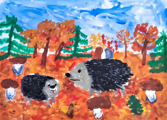 Евгения очень любознательная девочка, она любит гулять в парке Кусково вместе с родителями. Однажды летним днем в траве Евгения увидела ежей! Девочка решила их изобразить в своей работе. Ежи получились милые и забавные. Работа выполнена гуашью.